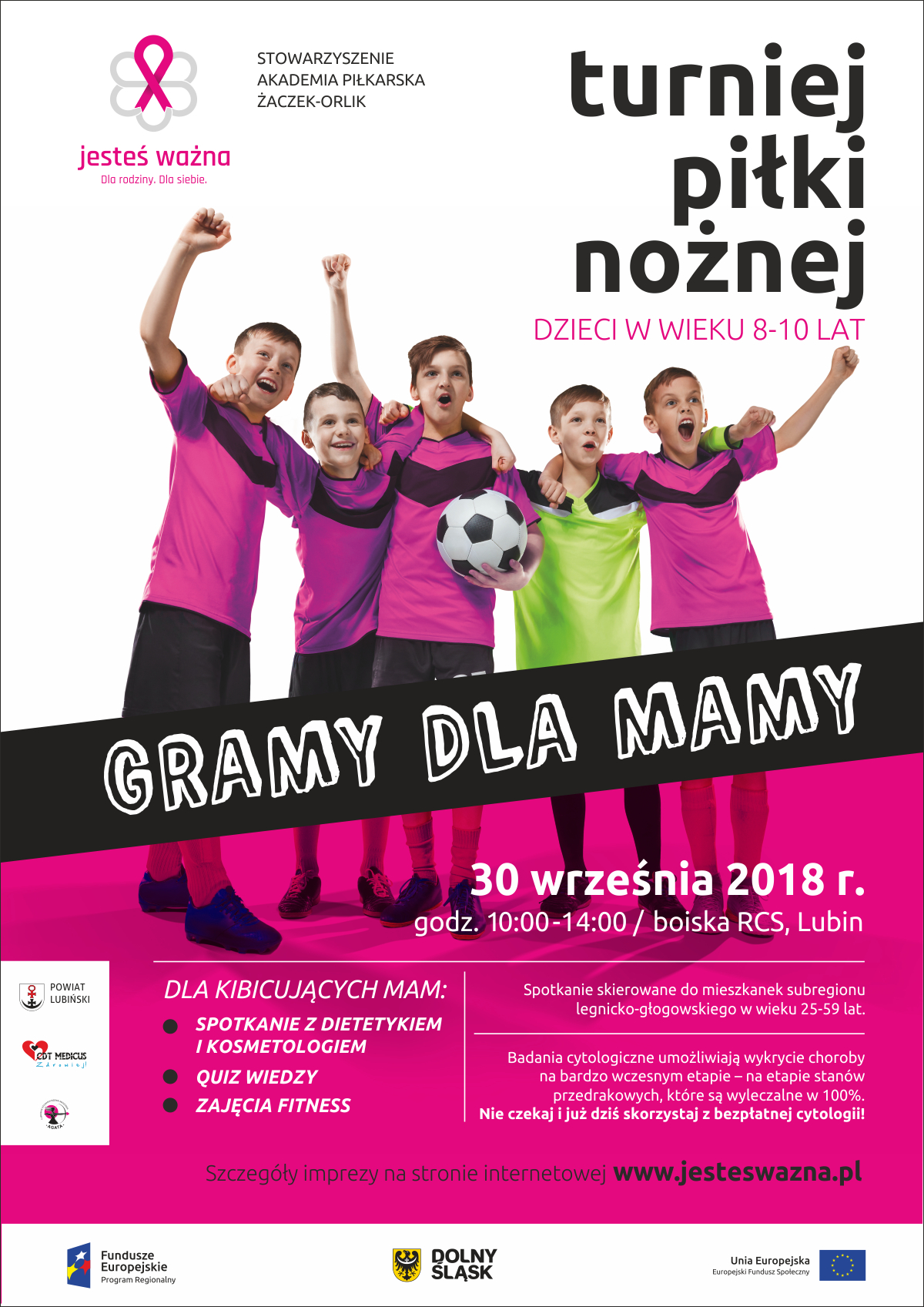 Powiat lubiński wraz z partnerami projektu zaprasza na turniej piłkarski „Gramy dla mamy” dla dzieci w wieku 8-10 lat. W zawodach rywalizować będą drużyny z powiatów subregionu legnicko-głogowskiego. Głównym celem spotkania jest promocja zdrowego trybu życia oraz zachęcenie kobiet do regularnego wykonywania profilaktycznych badań cytologicznych.