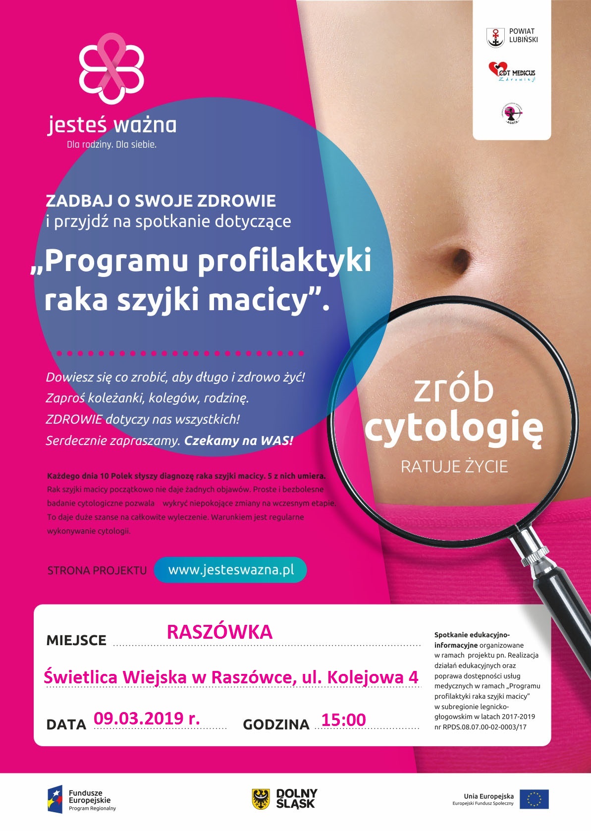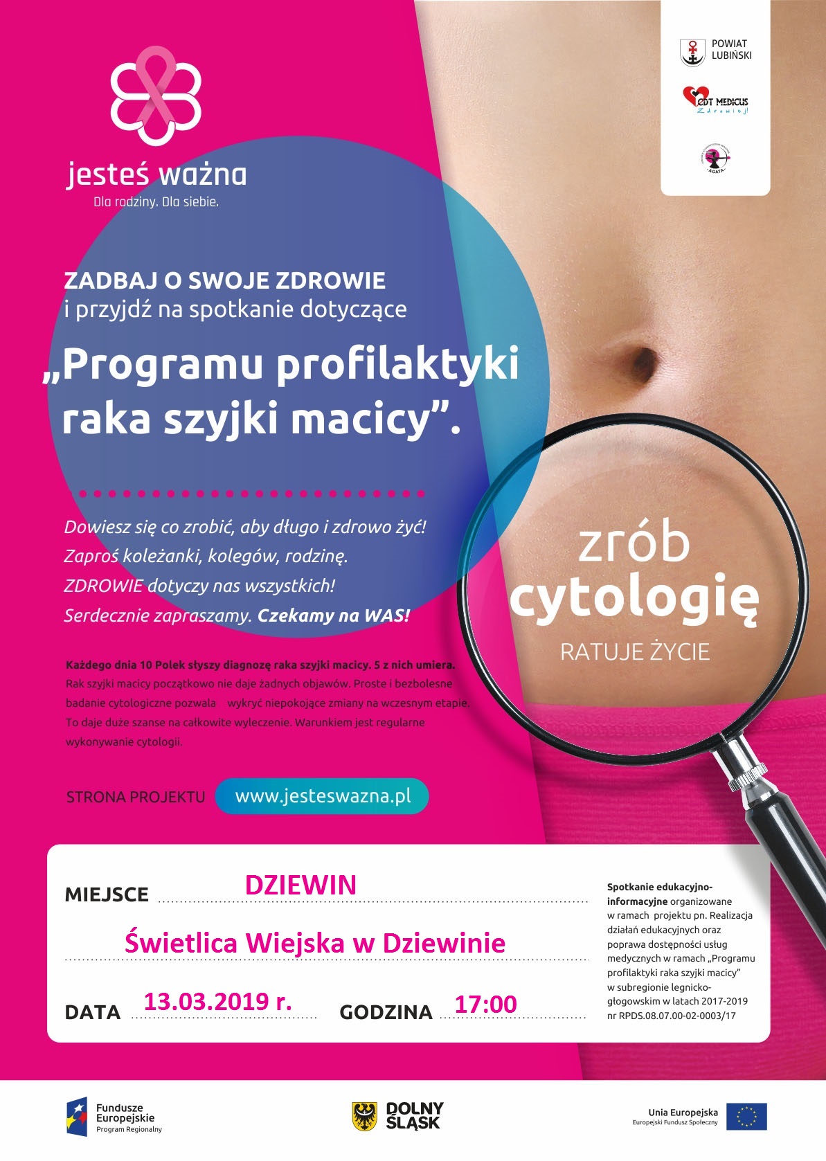 Chcemy dotrzeć do jak największego grona mieszkańców subregionu legnicko-głogowskiego aby przekazać informację o powadze wykonywania profilaktycznych badań cytologicznych. Ponadto na spotkaniach specjaliści opowiedzą Państwu jak zminimalizować ryzyko zachorowania i jak prowadzić zdrowy tryb życia.